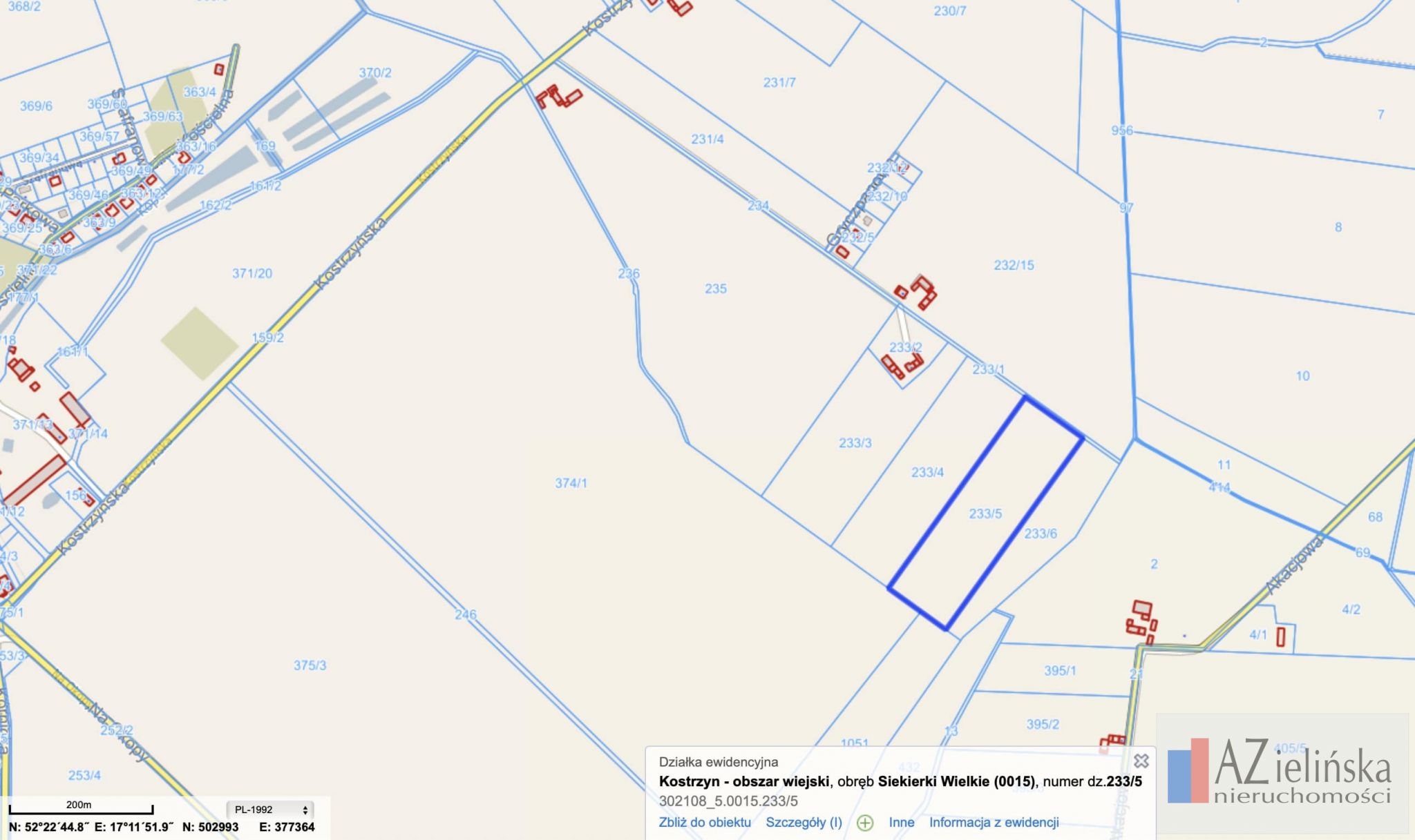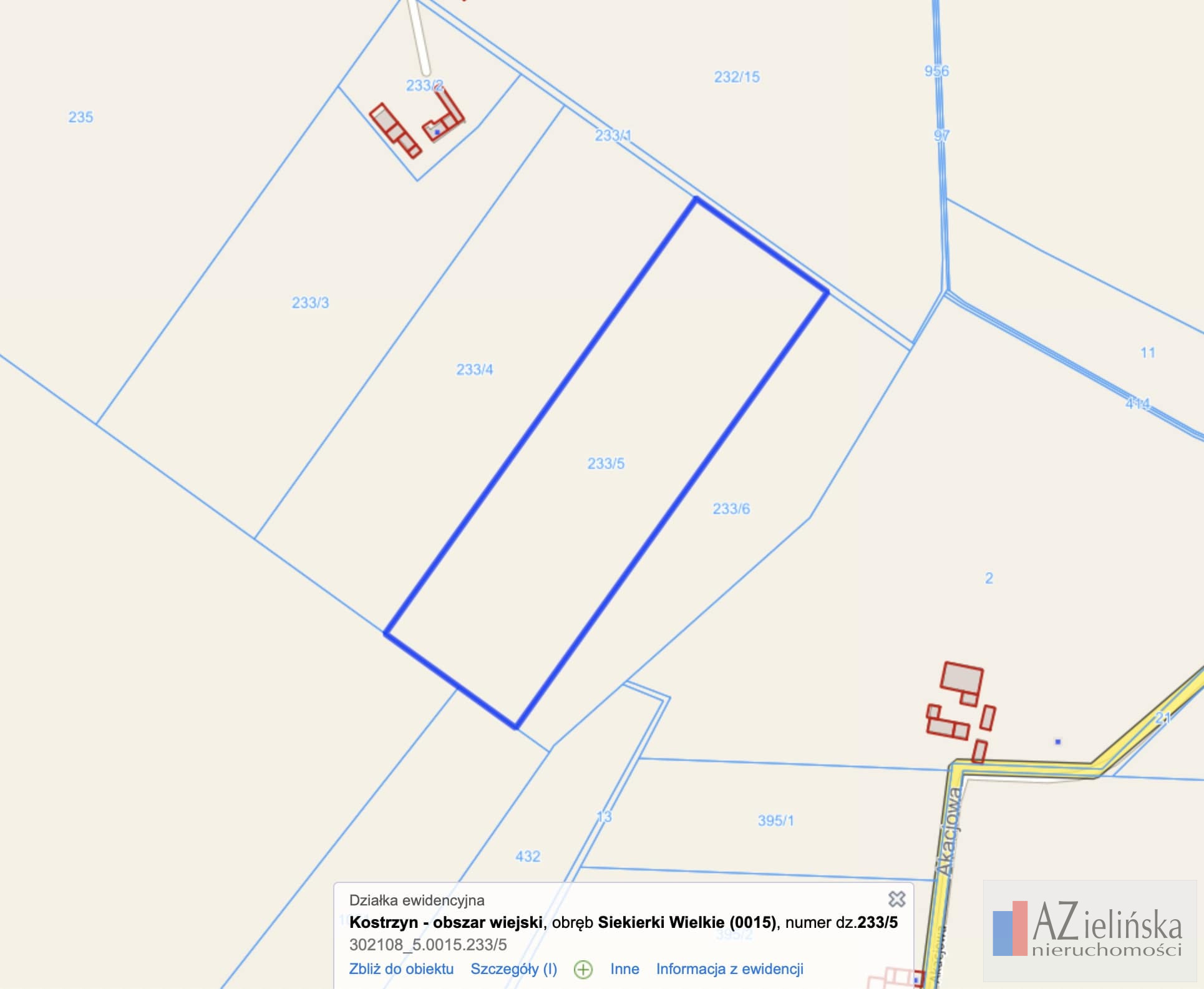 Na sprzedaż oferuję działkę rolną o powierzchni 5000 m², położoną w miejscowości Siekierki Wielkie, gmina Kostrzyn, w pobliżu ulicy Kostrzyńskiej.